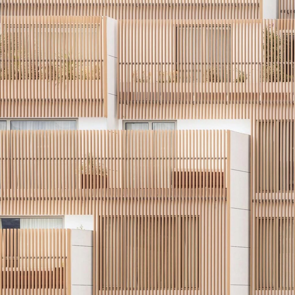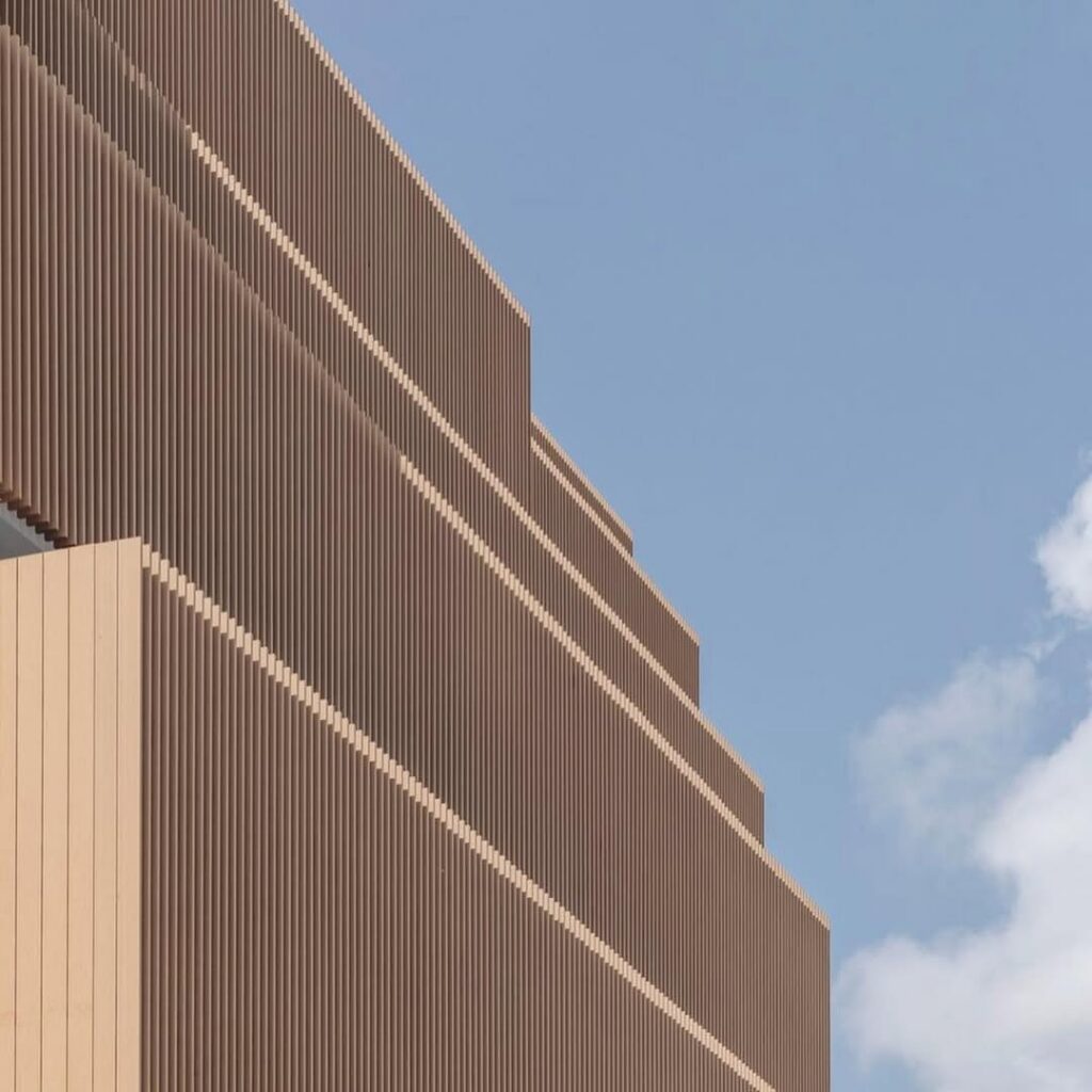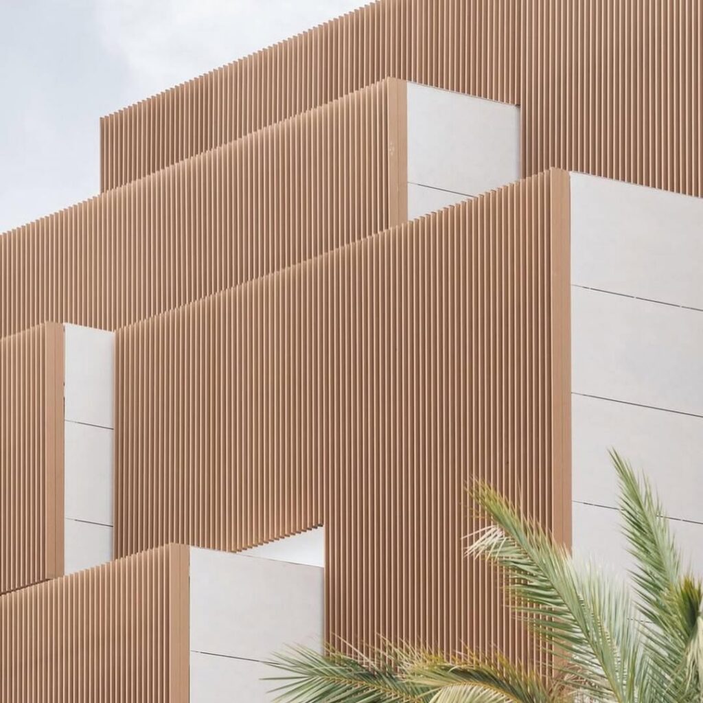 El objetivo era unificar arquitectónicamente y visualmente las dos intervenciones, otorgando al hotel de la exclusividad que le precede, a través de una serie de elegantes volúmenes escalonados y de un delicado juego de lamas verticales en aluminio revestidas en madera industrializada Geolam (Grupo Gamiz) y fachadas ligeras con aplacados de la marca Neolith FCV, bajo la dirección ejecutiva e industrial de Talleres Inox, como responsable de las fachadas y envolventes exteriores.