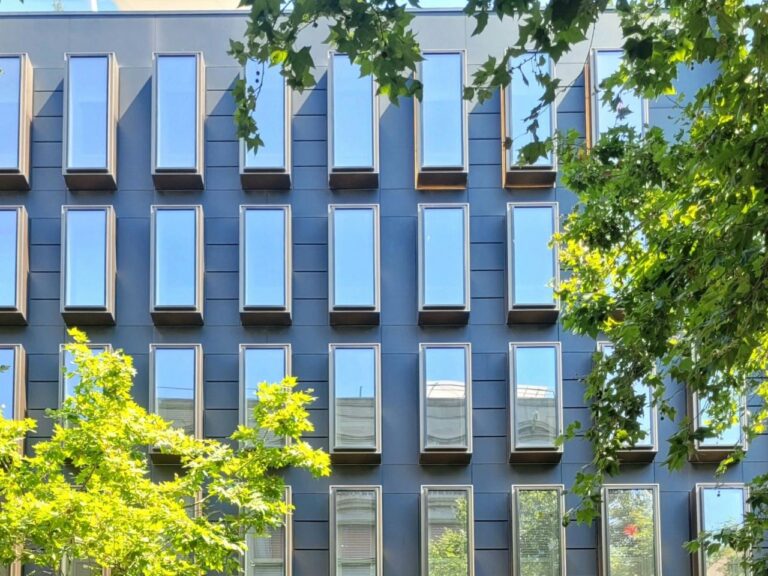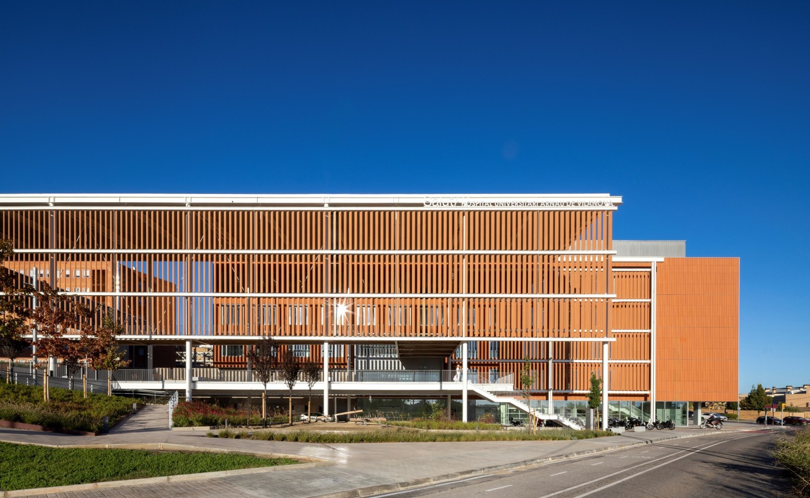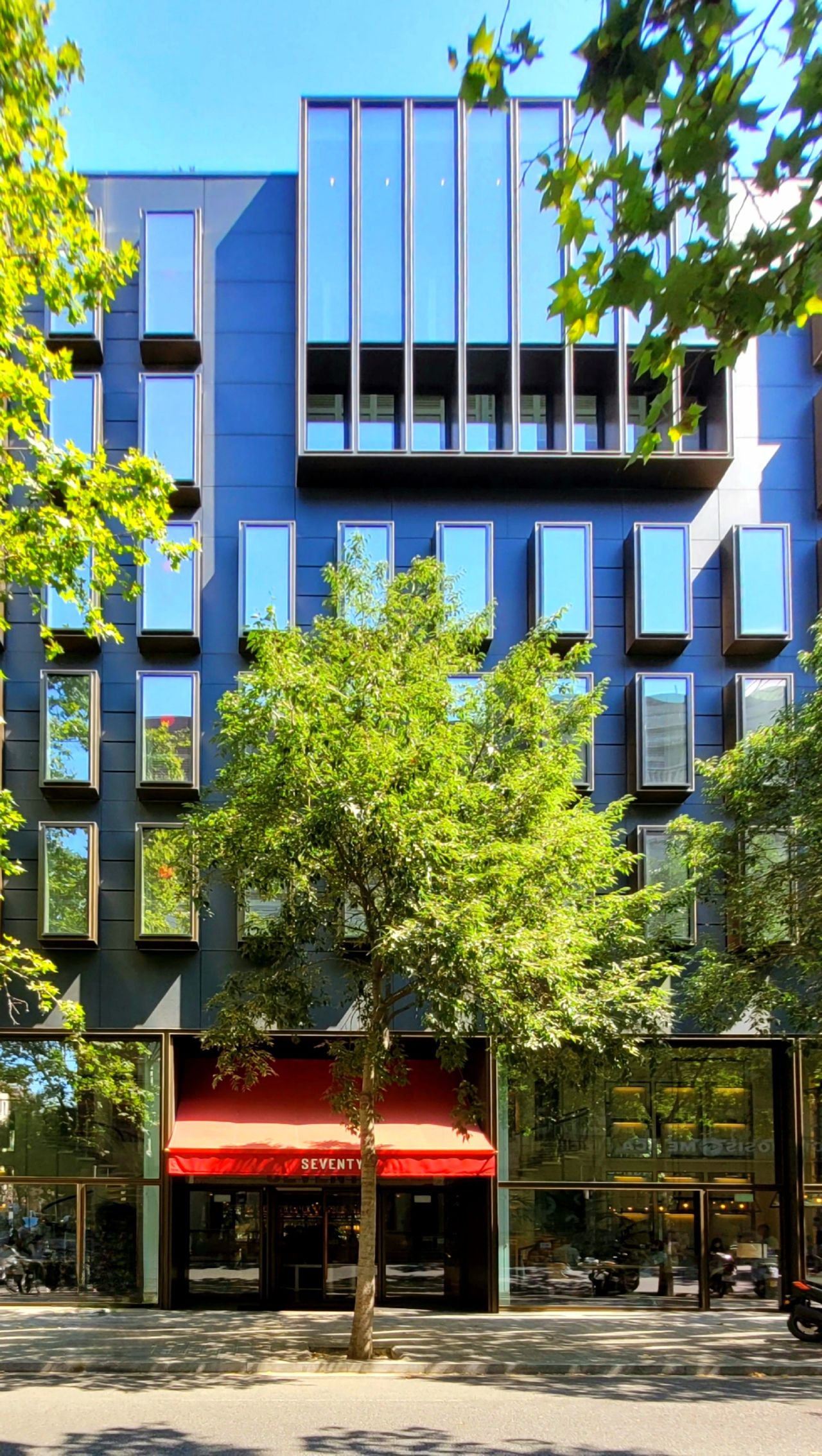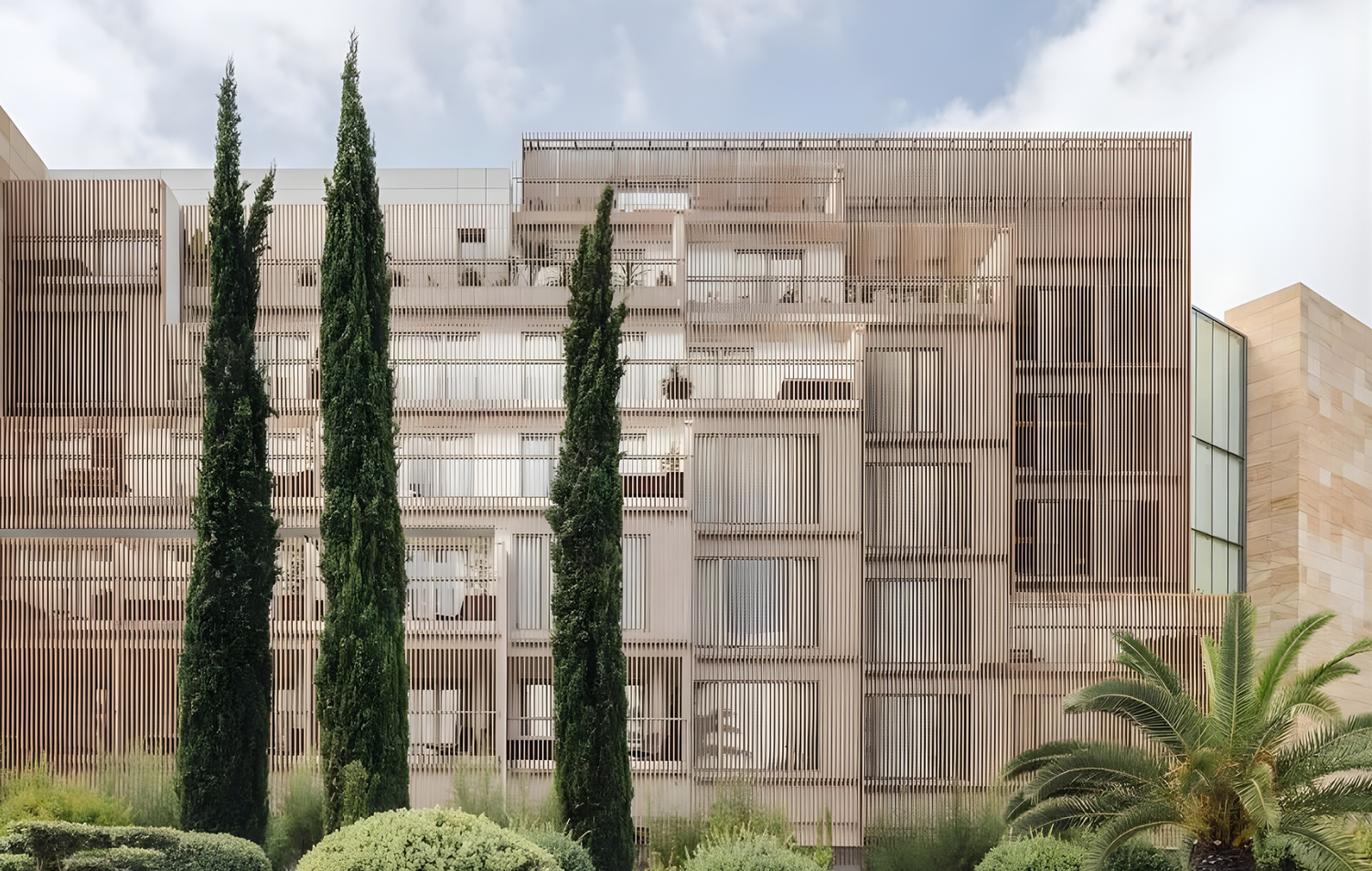 El objetivo era unificar arquitectónicamente y visualmente las dos intervenciones, otorgando al hotel de la exclusividad que le precede, a través de una serie de elegantes volúmenes escalonados y de un delicado juego de lamas verticales en aluminio revestidas en madera industrializada Geolam (Grupo Gamiz) y fachadas ligeras con aplacados de la marca Neolith FCV, bajo la dirección ejecutiva e industrial de Talleres Inox, como responsable de las fachadas y envolventes exteriores.